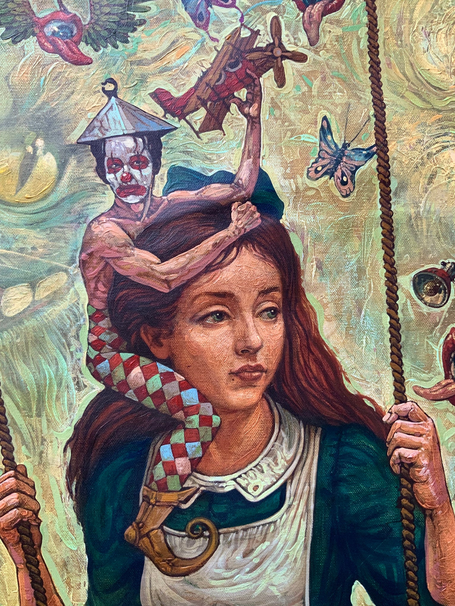This painting is a contemporary reimagining of one of Victor Huerta Batista Alicia en el País de las Maravillas celebrated masterworks from the early 2000s, Alicia en el País de las Maravillas, a piece that was quickly acquired by a private collector. The present work stands out as a remarkable achievement, with a level of detail and compositional clarity that surpasses the original source, reaffirming the imaginative power of Victor Huerta Batista Alicia en el País de las Maravillas.
